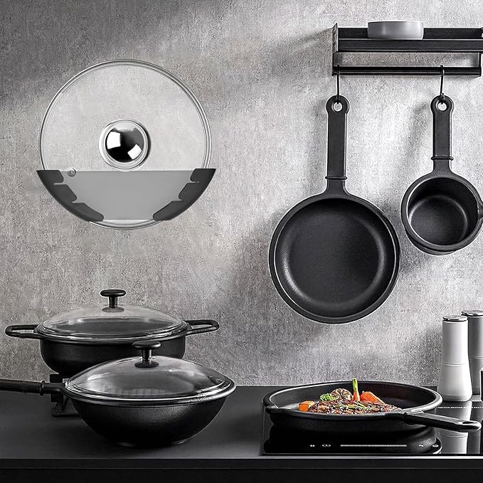 - Saving-Space Design : With our universal pot lid holder, you can organize the lids in a snap. Suitable for Cabenet door, deep drawer and wall mount. or kitchen wall.