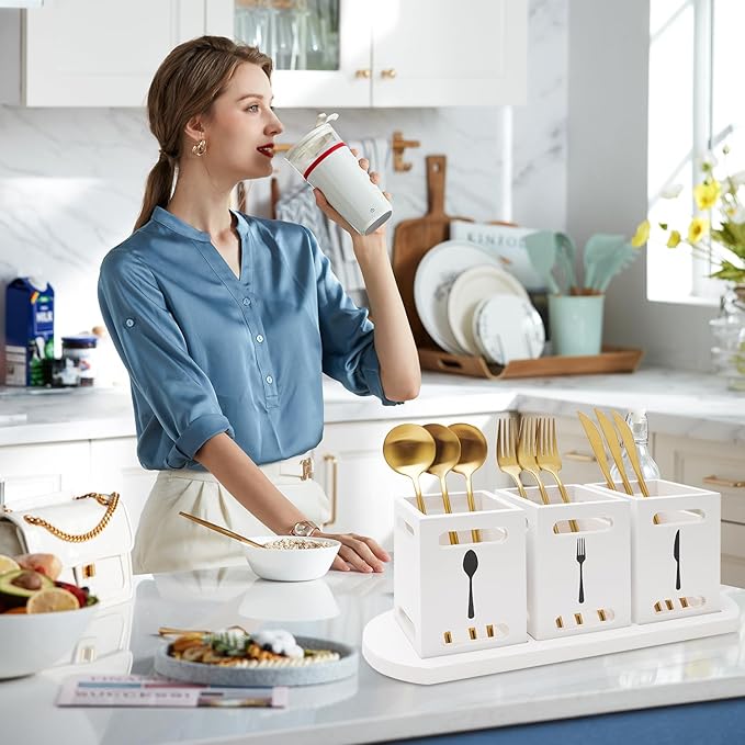 - Nice Combination: The package comes with 3 pieces of silverware holder with a wooden tray, 4 pieces in total. The generic yet stylish design makes this cutlery holder good for everyday use but can also be an excellent addition to a buffet table.