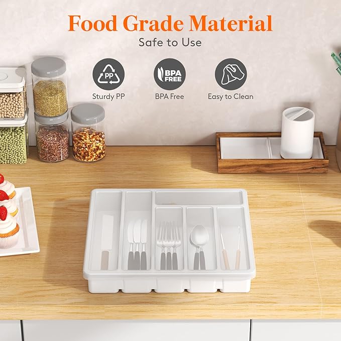 - 6 Compartments to Sort Your Flatware: The utensil organizer is divided into 6 compartments, perfect for sorting and storing flatware and kitchen utensils. Features 2 long compartments perfect for knives and large utensils, and 4 medium compartments for spoons, forks, and small gadgets.