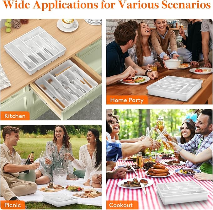 - Portable Design: Our flatware organizer for drawer is versatile and can be used for more than just organizing kitchenware. Its lightweight design makes it ideal for various occasions such as home parties, cookouts, picnics, camping, RV travel, and other outdoor events.