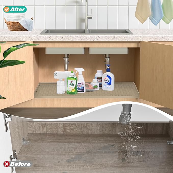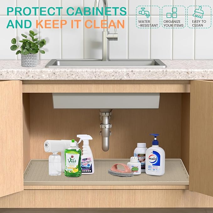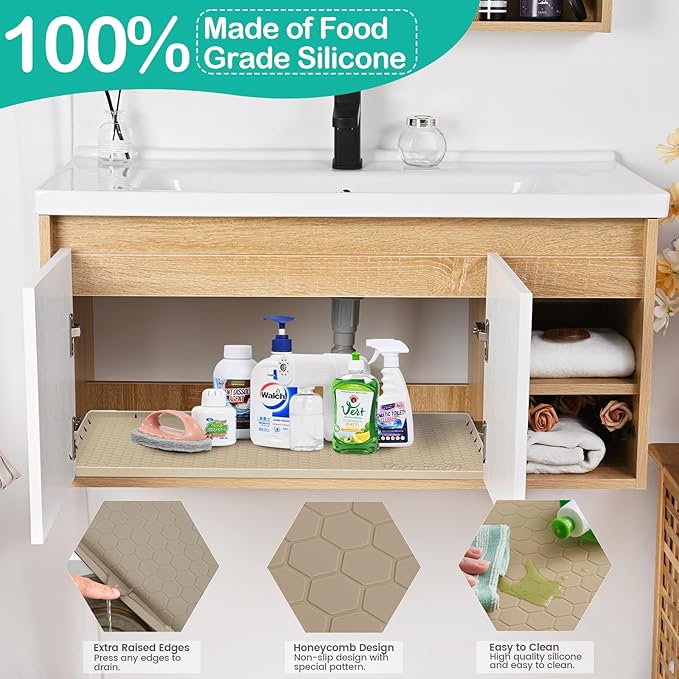 Waterproof Under Sink Mat 28" x 22", Silicone Cabinet Liner, Rubber Protector for Kitchen and Bathroom, Keeps Cabinets Clean, Dry, and Organized (Khaki)
