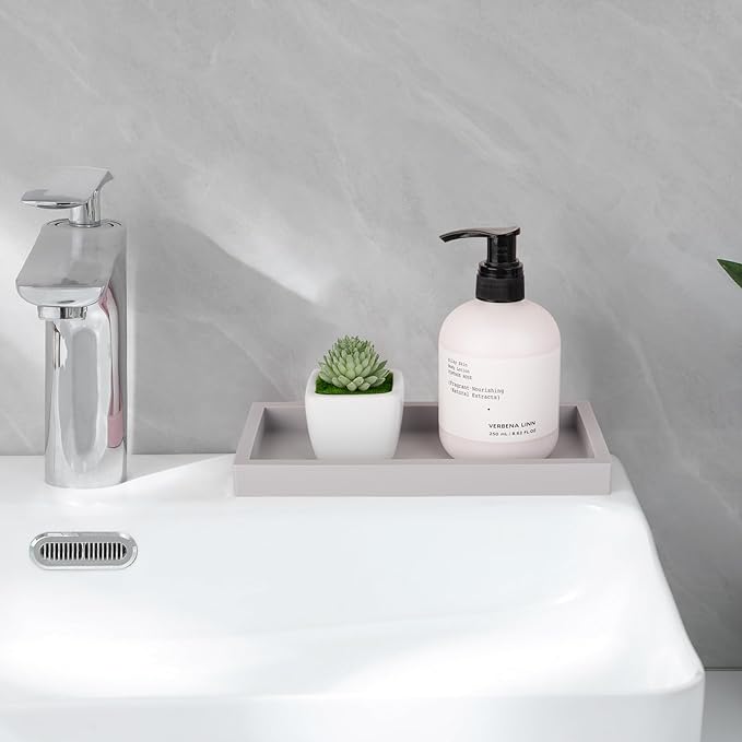 - MULTIPURPOSE: The bathroom counter tray can be used anywhere. It is not only a sink tray for dish soap dispensers, hand soap, sponge, scrubber, lotion bottles, but also a vanity tray for dresser tops to organize trinket, perfume, cologne, makeup, a toilet tank tray, or a desk accessory for keys and other small life essentials.