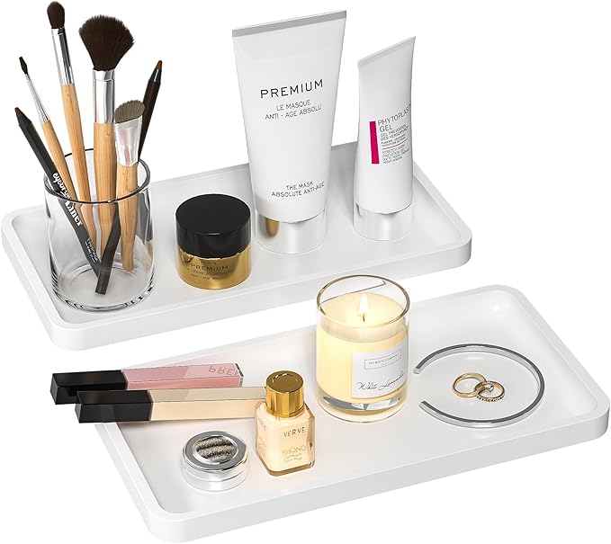 Weenson Bathroom Vanity Trays for Countertop Toiletries Decor Candle Perfume Makeup, Kitchen Tray for Soap Dispenser Spice Salt Oil, White Tray for Toilet Tank Coffee Nightstand Set of 2