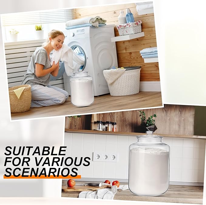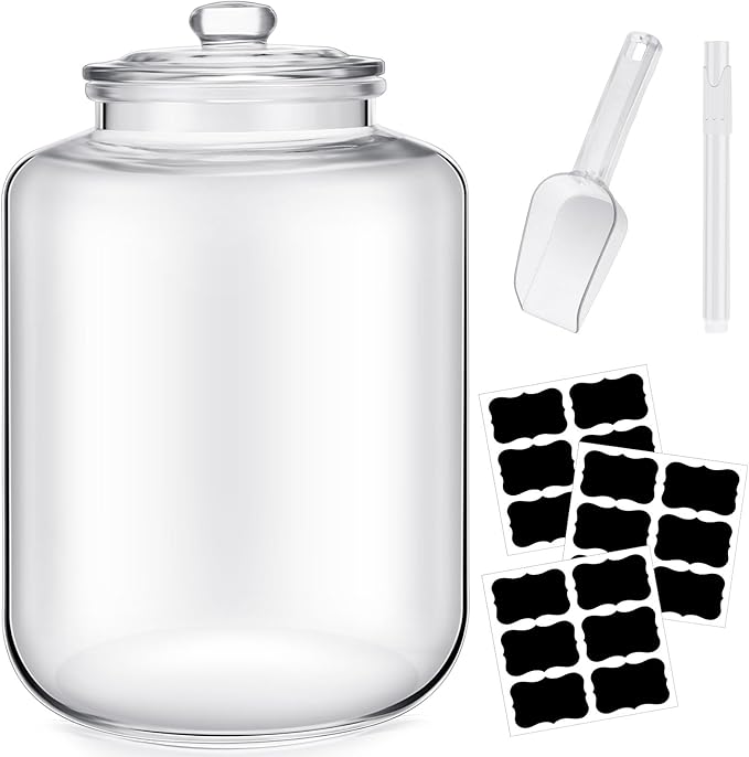 - Versatile Usage: these glass jars with lids offer multi functional usage; With a generous capacity of about 6 gallons, they become suitable for storing cookies, snacks, candy, grain, and more; These gallon glass jars with lids come with an ice shovel, 3 distinctive stickers and a liquid pen, making it easier to organize and identify the items stored in them