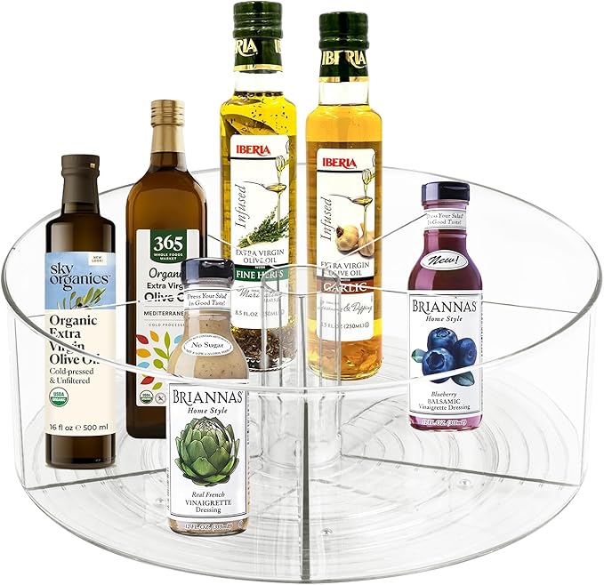 - 360° Rotating & Easy Access: with rotating base design, this turntable lazy susan organizer can rotate 360° smoothly. The premium clear material makes it visible, keeps your space organized and easy access to everything you need. Ideal for items in kitchen, cabinets, fridge, laundry, countertop, shelves, office, vanity and bathroom. the turntable tray helps to organize bathroom kitchen area in a more aesthetic way, takes up less room and have all your daily essential items neat, organized and at arm’s reach.