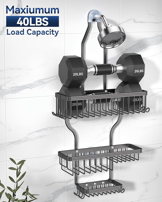 - Non-Slip Bathroom Organizer - Thanks to the anti-slip rubber circle on the top of the shower hanger and wall fixing accessories (1 suction cups and 2 adhesive), the shower hanger remains stable even when the shower organizer over shower head is filled with bottles. The two wall fixing methods can apply to a variety of walls, and you can choose one of them according to your needs