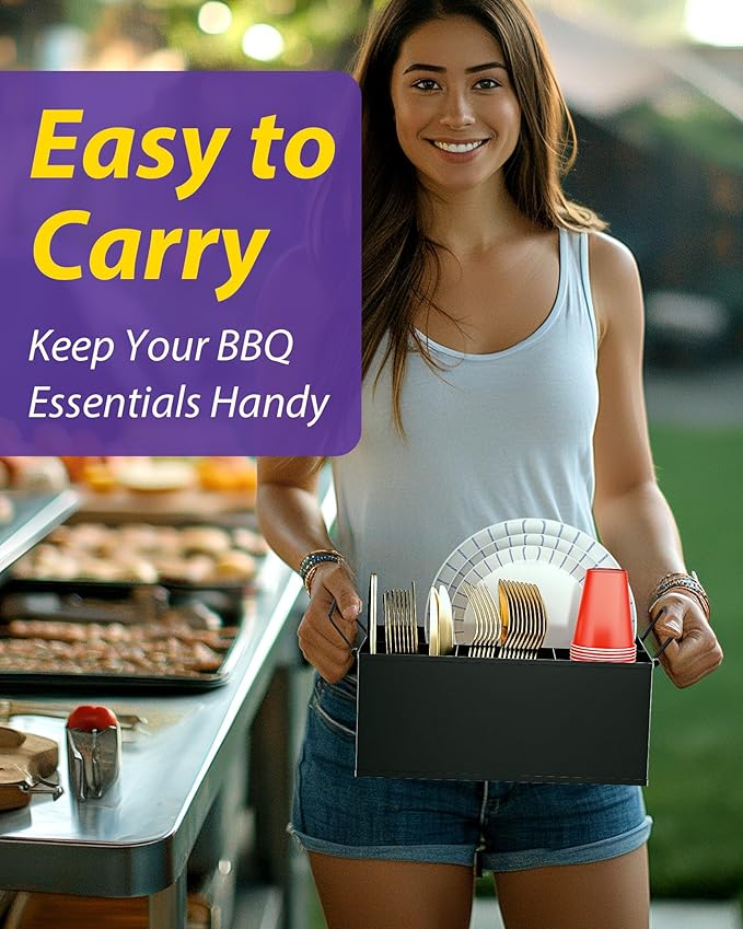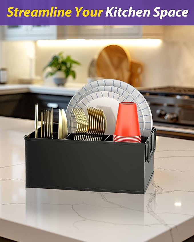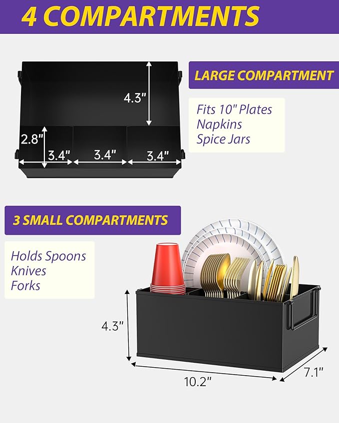 - ππ¦π£ππππ’π¨π¦ π°-ππ‘-π πππ¦πππ‘ βΆ Featuring a large capacity with 4 distinct compartments, this paper plate organizer measures 7.1"D x 10.2"W x 4.3"H. This versatile utensil holder for party efficiently stores plates, cutlery, napkins, and more, ensuring everything is neatly organized and easily accessible.