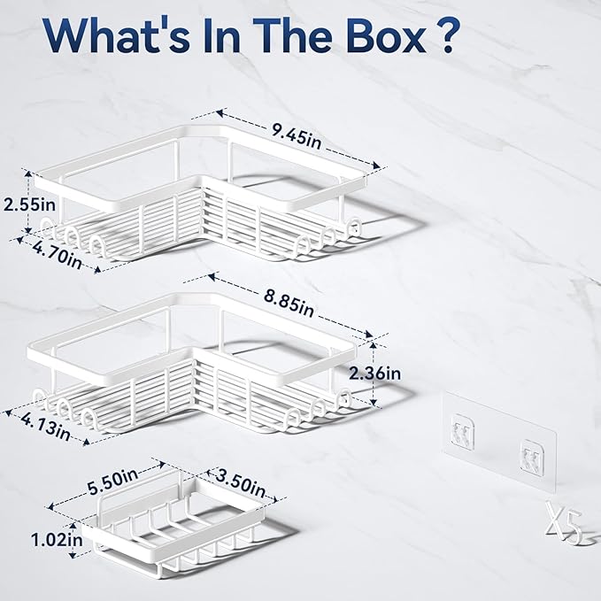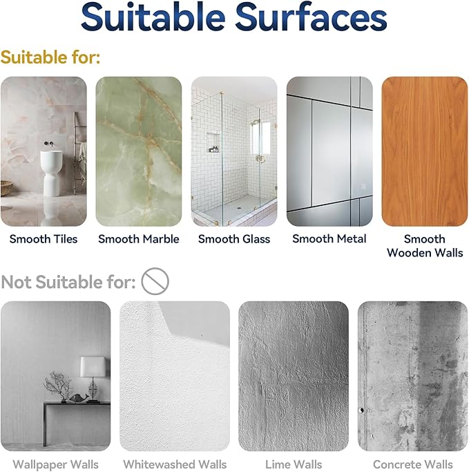 - Suitable for Various Walls: Smooth tile, marble, tempered glass, wood wall, and solid metal are all suitable for installing this bathroom shower organizer. Suitable for bathroom, toilet, kitchen, powder room, etc. Wallpaper wall, stucco wall, lime wall, or concrete wall is not recommended. This corner shower caddy includes 2 × adhesive shower caddies, 1 × soap holder, 5 × adhesive stickers, 1 × user manual