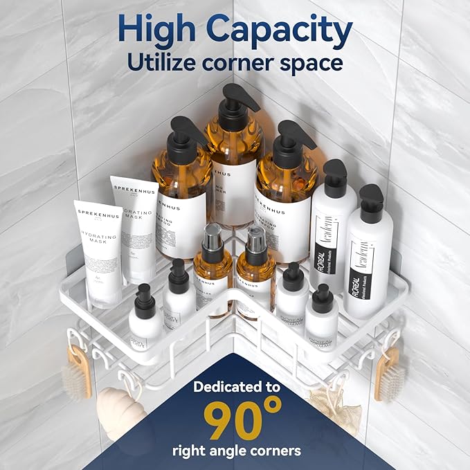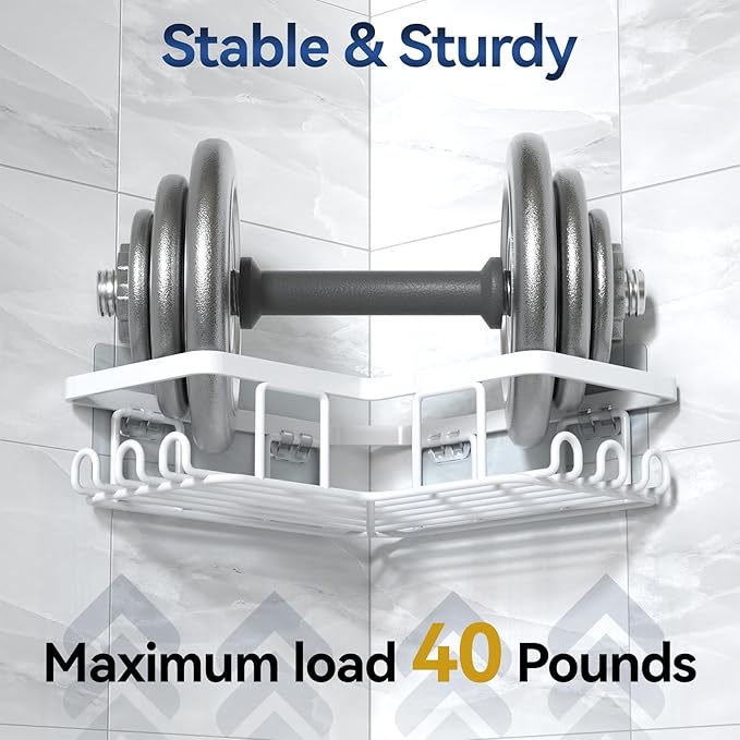 - Space-Saving L-Shaped Design: This “L” Shape of the corner shower caddy is designed for making full use of corner space. With the large-area adhesive, the capacity of the corner shower caddy is up to 40 lbs, which is equal to 19 bottles of 34oz shampoo/shower gel/body lotion weight. Note: This shower caddy fits 90 degrees wall corner, not suitable for rounded or curved corner space
