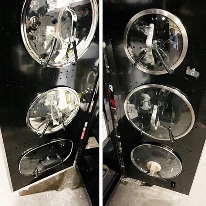 - Space saving - The glass lid is large and bulky, taking up too much cabinet space. Install them on the inside of the cabinet door. Lids are out of the way but within easy reach. Our cover racks can be placed on countertops, walls, cabinet doors, sides of cabinets, interior doors of food storage rooms, and even under sinks. This space saving device is the perfect solution to meet your cooking cover storage needs. Easy to install, almost suitable for all your pot lids.