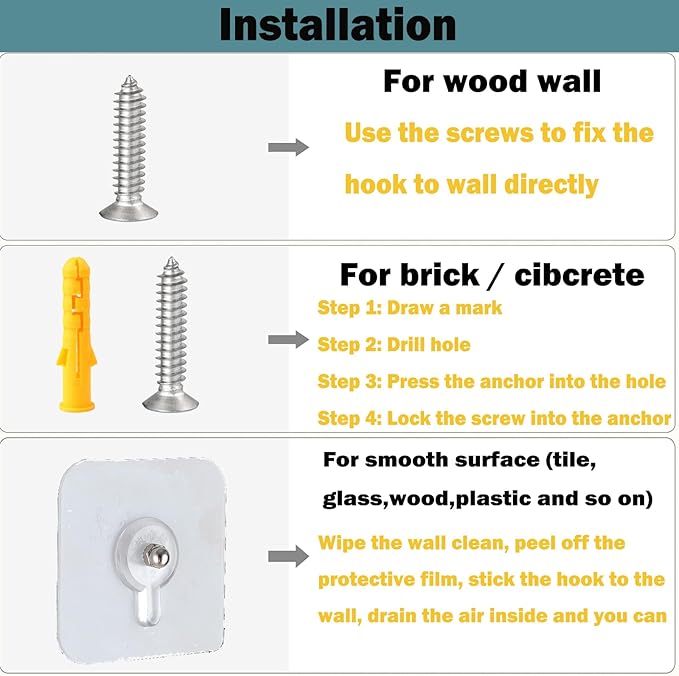 - Two installation methods - strong self-adhesive adhesive installation and screw installation. Strong self-adhesive adhesive can be installed on smooth walls or cabinet doors, and screws are suitable for various rough walls. Very convenient, suitable for installation and use in various scenarios. ( NOTE: When installing the cabinet door with self-adhesive adhesive, please fix both bracket arms at the same time to prevent the bracket from moving when opening the door.)