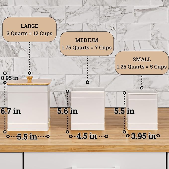 - DECORATIVE & FUNCTIONAL - Designed for display with a sleek matte white powder coated finish and contrasting bamboo lids, these decorative kitchen jars match any décor from farmhouse to modern. Made of iron, these white kitchen accessories are light and not breakable, but sturdy and designed to last, as well as being easy to hand wash.