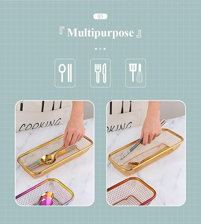 - VERSATILE USE--The 4-sided tripod design on the bottom of the organizer is non-slip and more stable, which makes the utensils easy to drain and avoid bacterial growth.The 2-piece stainless steel cutlery holder can store sharp knives, spoons and chopsticks separately to make your kitchen more organized. It can also be placed on the table for napkins and towels, or you can place it in your kitchen and home bathroom or bedroom cabinet drawers to organize other miscellaneous items.