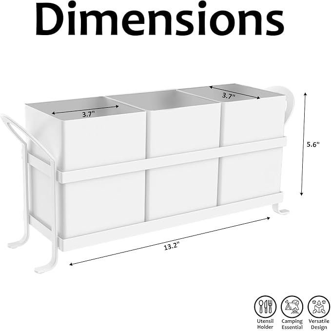 - Spacious & Functional: The container measures 13.2" L x 5.6" H x 3.8" W and has three compartments that hold knives, spoons, forks, skaters, peelers, bottle openers, silverware, or any other kitchen gadget neatly in place.