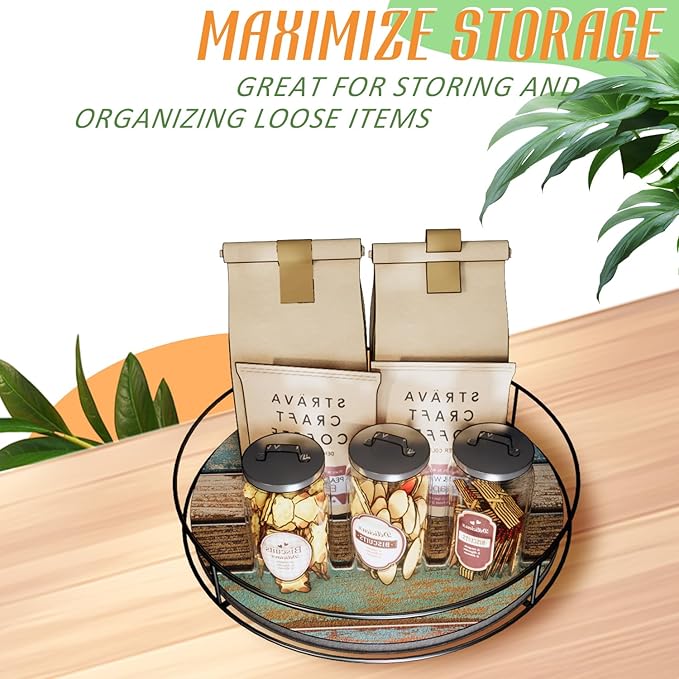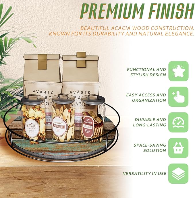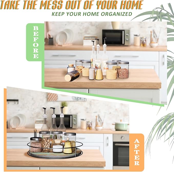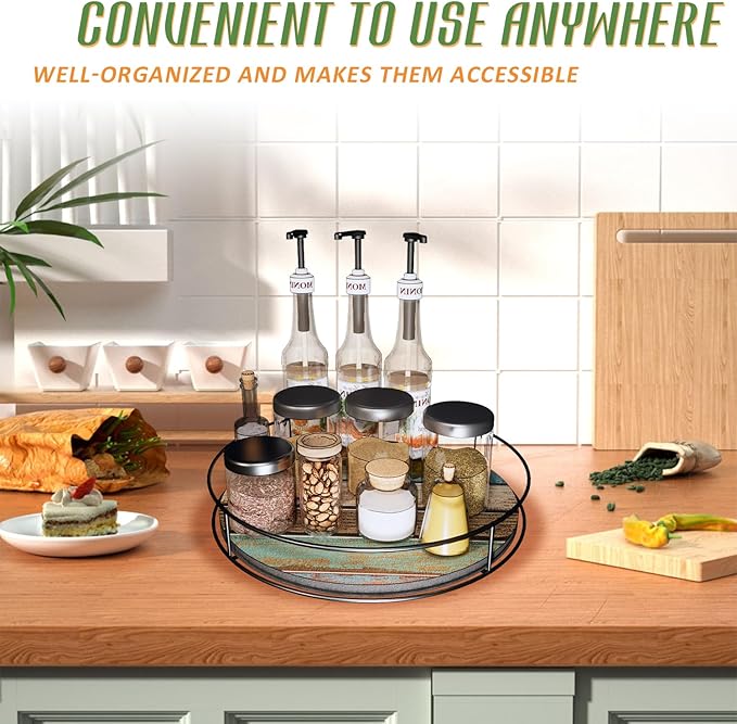 - 【HIGH QUALITY】Our turntable organizers used premium wood and carbon steel for durability and a touch of elegance in your space. Enhance organization with 360°spinning, non-skid pads, and easy-grip handles for quick access to your essentials.