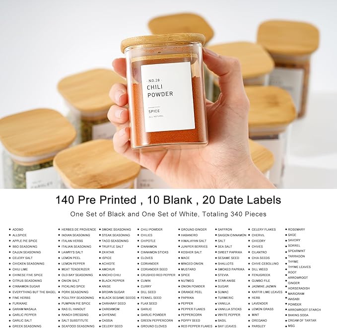 - [COMPLETE SET OF LABELS] :You Will Get A Total of 140 Pre Printed Labels (120 Spice Labels+24 Date Labels+12 Blank Labels) With 1 Black Marker to Meet Your Organizing Needs