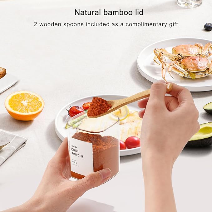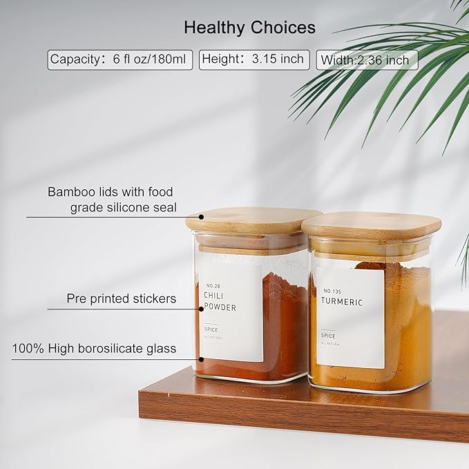 - [PACKAGE DESIGN] :12 High Airtightness 6 oz Square Glass Jars with Bamboo Lids, keeping Ingredients Fresh While Showcasing Your Kitchen Beautifully