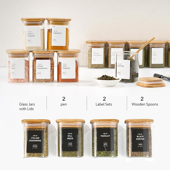 - [PERFECT SIZE]:The Size of The Jar is 3.14 x 2.36 x 2.36 Inches, with An Actual Capacity of 6 fl.oz/180ml. This Most Popular Size is Particularly Suitable for Spices and Herbs, Making It Convenient for Personalized Management of Your Pantry