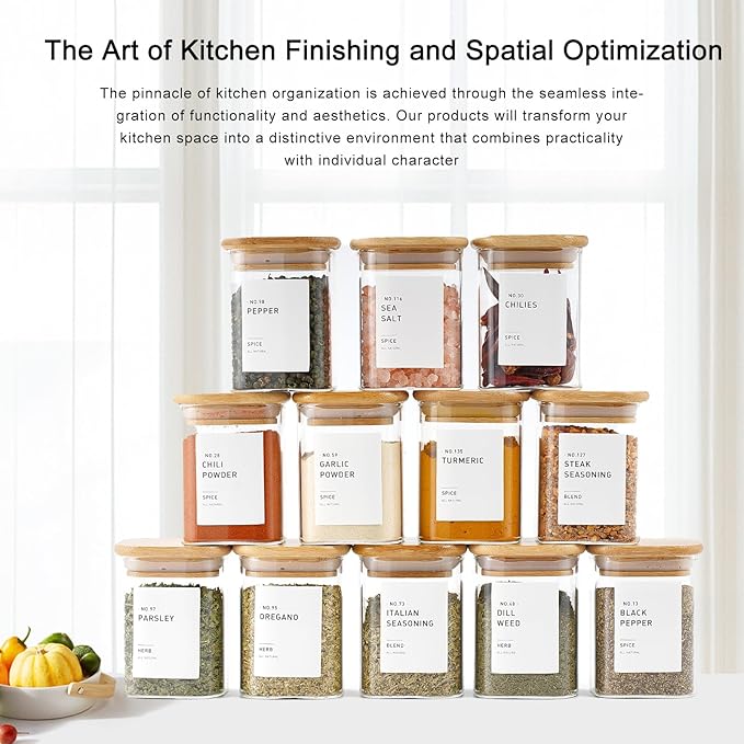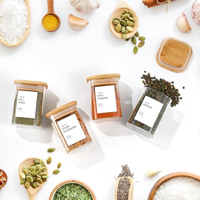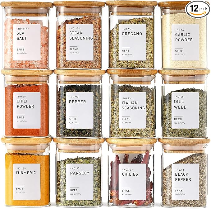 12Pcs Glass Spice Jars with Bamboo Airtight Lids, 6oz Spice Containers with 340 Preprinted Spice Labels of White and Black Color, Empty Seasoning Containers for Spice Salt Sugar Herb