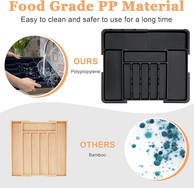 - Premium Food Grade Material: The silverware drawer organizer for kitchen utensils is crafted from premium PP material that is BPA-free and long-lasting for use. Just rest assured that it can guarantee the safety of all your utensils, silverware, and flatware.
