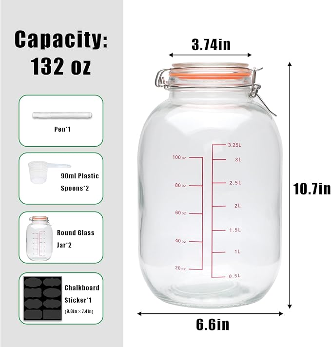- Dual Measurement Marks: Our 1-gallon glass jars with lids are equipped with measurement marks in both ounces (oz) and liters (L),ensuring precise storage and measurement.This dual-scale feature ensures accuracy whether you’re following with recipes or tracking quantities.