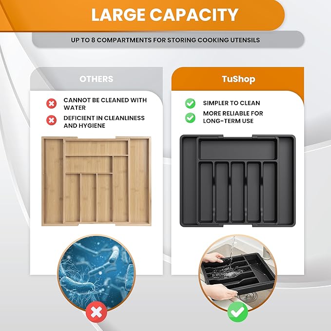 - ✅ 【EFFORTLESS ORGANIZATION】: Declutter your drawers and countertops effortlessly with this expandable utensil drawer organizer. This versatile kitchen drawer organizer for utensils simplifies storage solutions for flatware, cutlery, cosmetics, jewelry, and stationary. Find what you need in seconds without chaos and fuss.