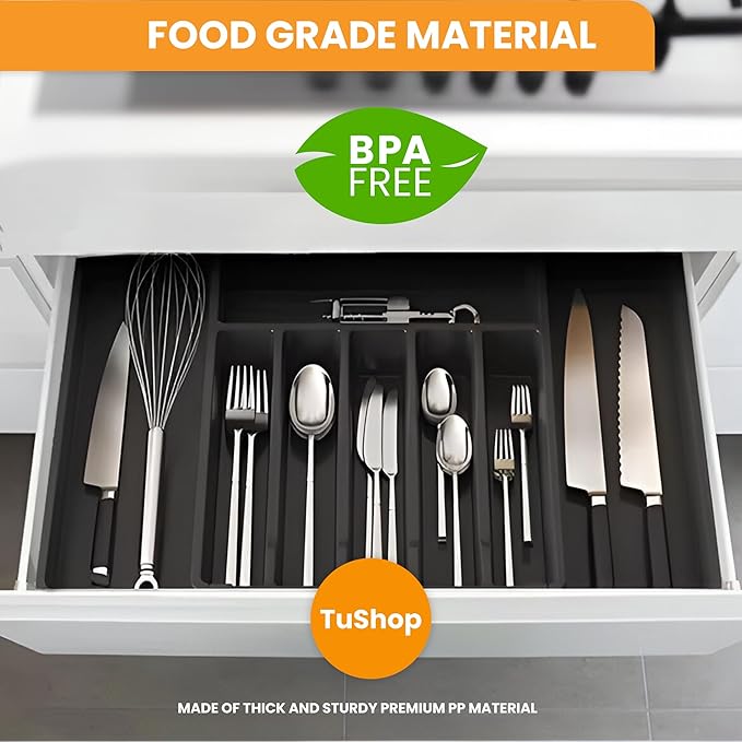 - ✅ 【PREMIUM QUALITY AND SAFETY】: Crafted from premium BPA-free PP material, this drawer organizer ensures durability and safety for all your kitchen utensils, silverware, and flatware. Cleaning this plastic silverware organizer is a breeze—just rinse with water or wipe with a damp cloth.