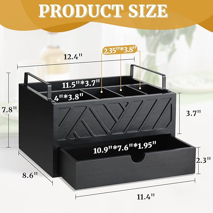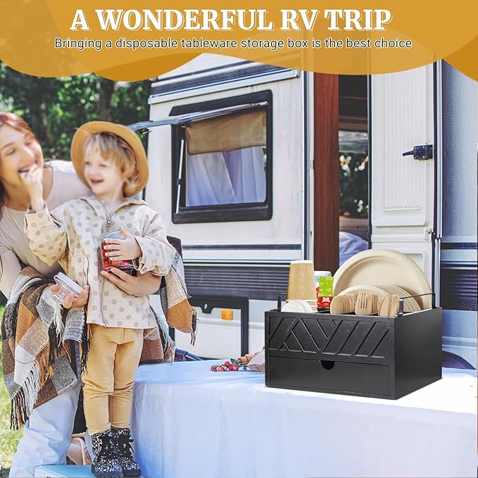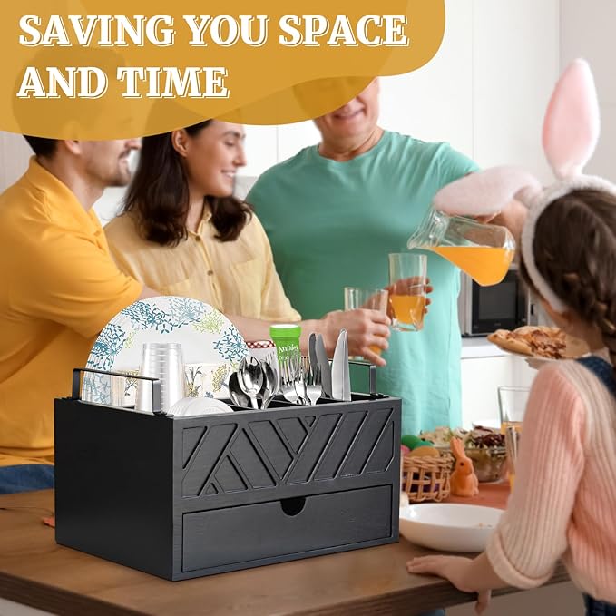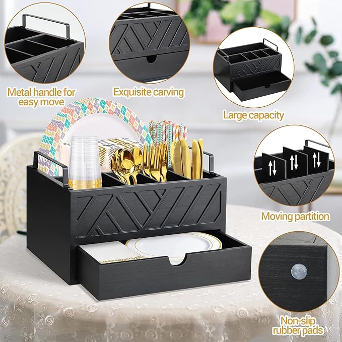 - 【Paper Plate Dispenser with Drawer & Handles】Featuring 5 compartments and a drawer, our kitchen paper plate holders will help you separate and organize disposable dishes, spoons, forks, knives, napkins, paper cups, straws, condiments. Carefully designed with 2 metal handles, this wood black utensil caddy is easy to carry and adds aesthetic appeal. The open top design makes your kitchen accessories within reach. Elevate your dining experience with our meticulously crafted silverwar caddy.