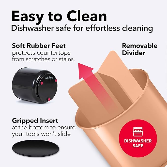 - CLEANING IS A BREEZE - Other metal utensil holders can rust and stain your counters with ugly spots over time, or they can scratch your countertops. Our cutlery holder has rubberized feet to ensure that it won't harm your counter or slide around, and is completely RUST-PROOF. The divider and gripped insert are easily removable, for hassle-free cleaning. The whole utensil crock is 100% DISHWASHER SAFE!