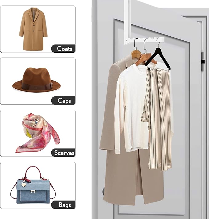 - *Strong Over The Door Hooks* This over the door hanger for clothes are heavy duty made and enough sturdy for hanging wet clothes for air drying in your laundry room. It is also an over door clothes organizer for hanging your clothes, coats, suits, weekly outfits, hats, bags behind your door.