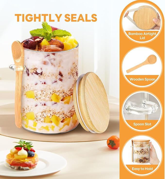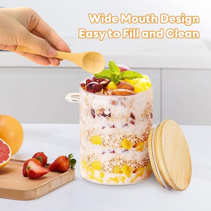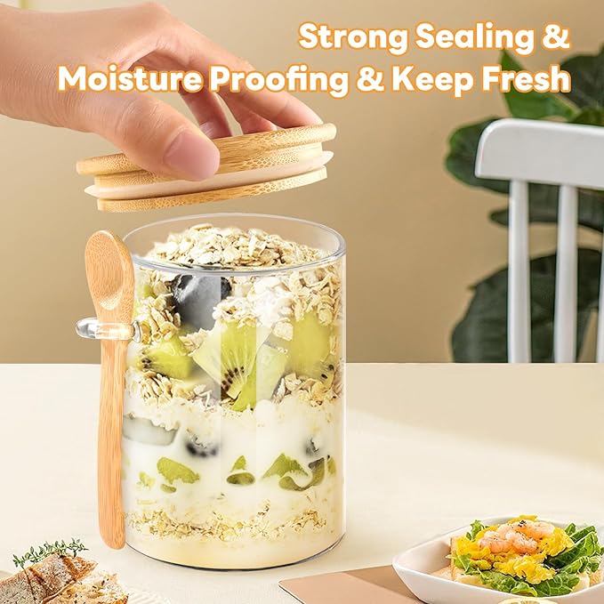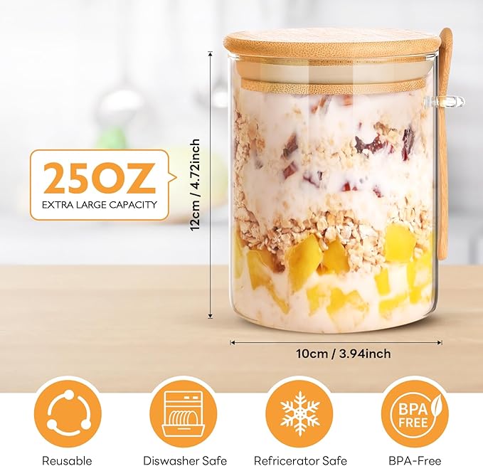 - 【DISHWASHER SAFE】The glass jar overnight oats with wide mouth are easy to clean, simply wash it under warm water or throw them in the dishwasher. Kindly recommend to take off the lid and spoon before washing them in dishwasher.