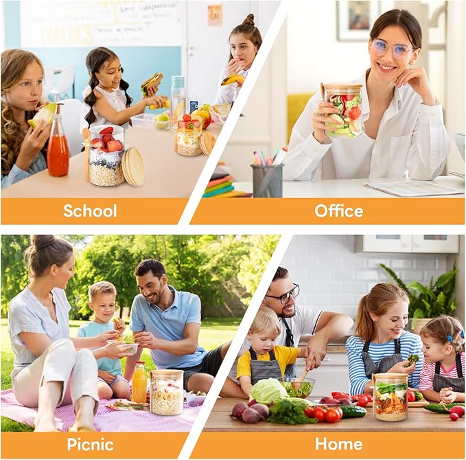 - 【HIGHLY QUALITY GLASS】This Salad Meal Prep Jar with Bamboo Lids are made of thickened high-quality borosilicate glass material, with high hardness and no lead, which is more healthy and safe. In addition, it can withstand the sudden change of temperature difference between cold and heat, and does not burst, so that you can use more secure.