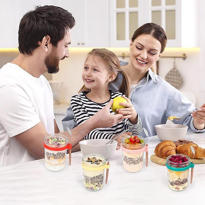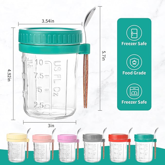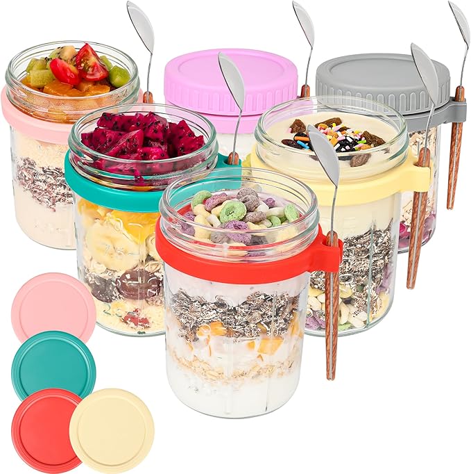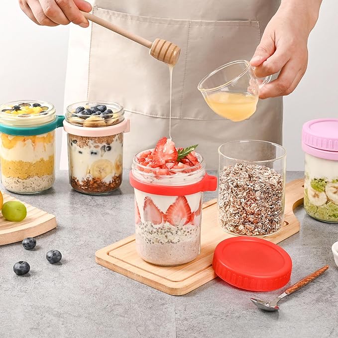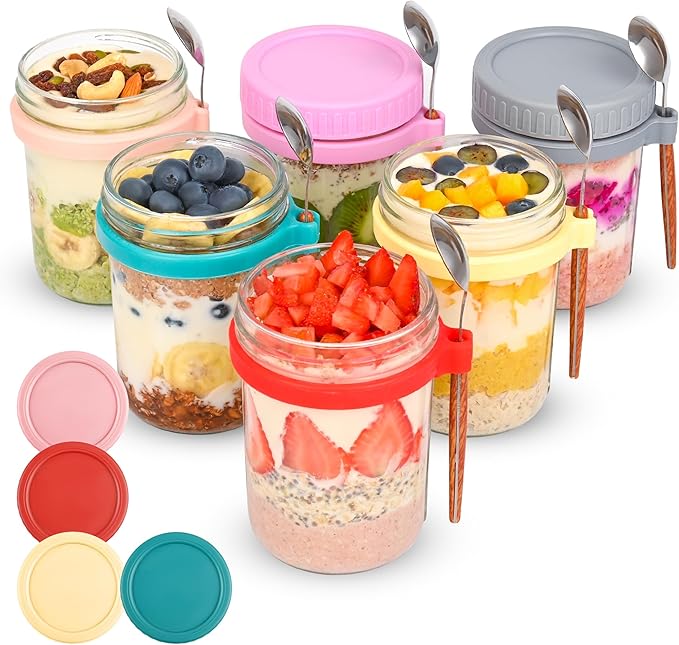 - Perfect Portion Control: Take control of your breakfast portions with our 18 oz overnight oats containers with lids for Portion Control. Designed for those who want to maintain a balanced diet. 6 glass jars with lids to measure oats, fruits,and toppings precisely. Whether you prefer a single serving or enough oats for the whole family. This makes planning and maintaining a healthy diet easy.