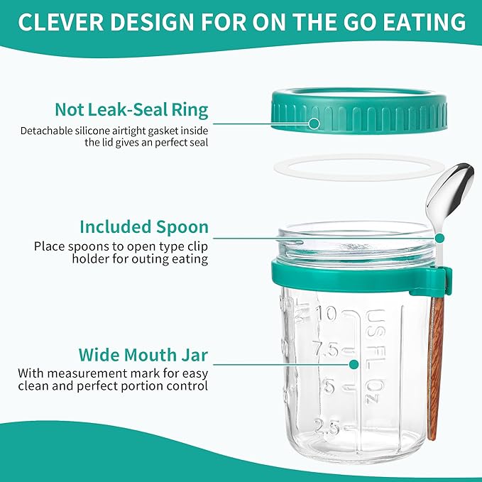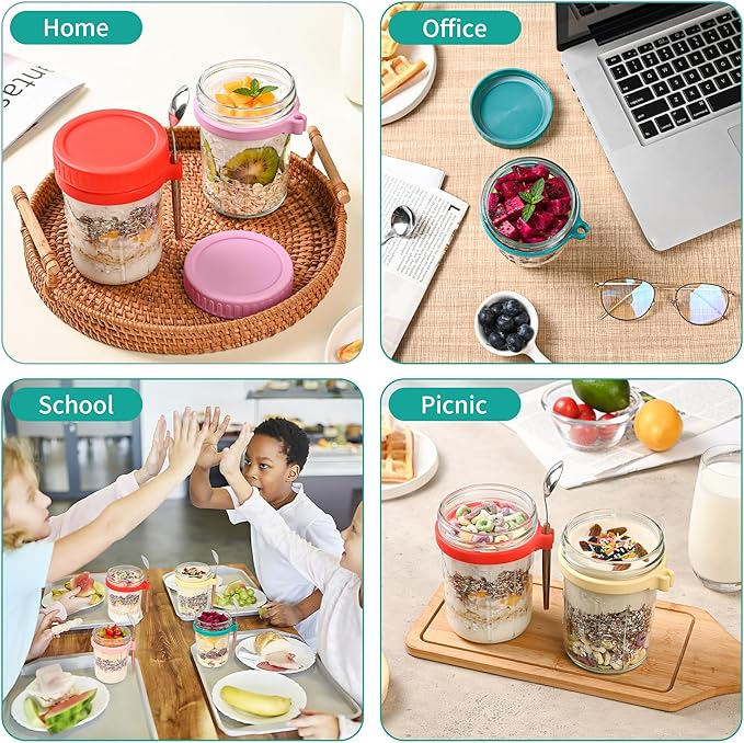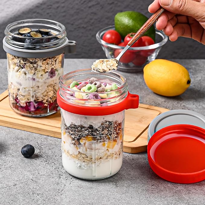 - Convenient and Versatile: These mason jars with airtight lid are specially designed for preparing and storing overnight oats. Their wide mouth and airtight lid make it easy to fill, stir, and enjoy your oats. Moreover, these jars with airtight lids are versatile, suitable for various other food storage needs like yogurt, chia pudding,fruits, salads, and more