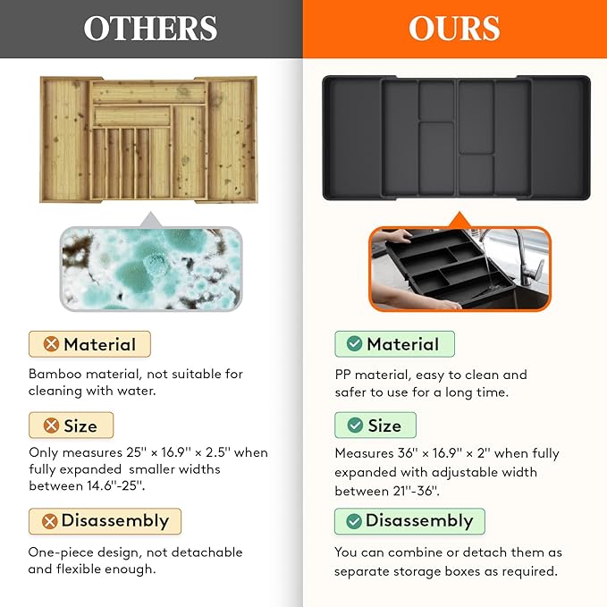 - Adjustable Dimensions: This utensil drawer organizer is adjustable and can fit drawer widths ranging from 21.3" to 36". It can hold various kitchen utensils and has dimensions of 36" × 16.9" × 2" when fully expanded, and 21.3" × 16.9" × 2" when fully folded. Please make sure to measure your drawer before ordering.