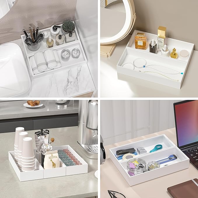 - Multi-functional Drawer Organizer Tray - Say goodbye to having multiple messy junk drawers and always having to dig deep for any needed items. Used in kitchen to organize spoons, spatulas, spices, baking utensils and other kitchen gadgets; used as bathroom vanity tray to keep perfume, candle, jewelry, trinket neatly; or used as desk organizers to accommodate your desk supplies, like your pens, post-its, paper clips etc. It will make a great addition in your home or office