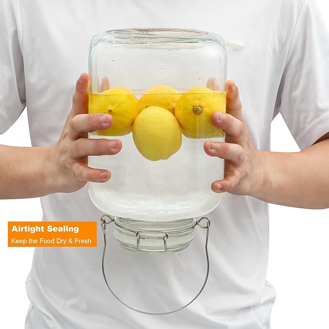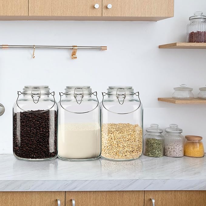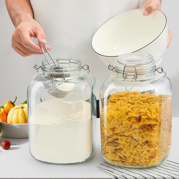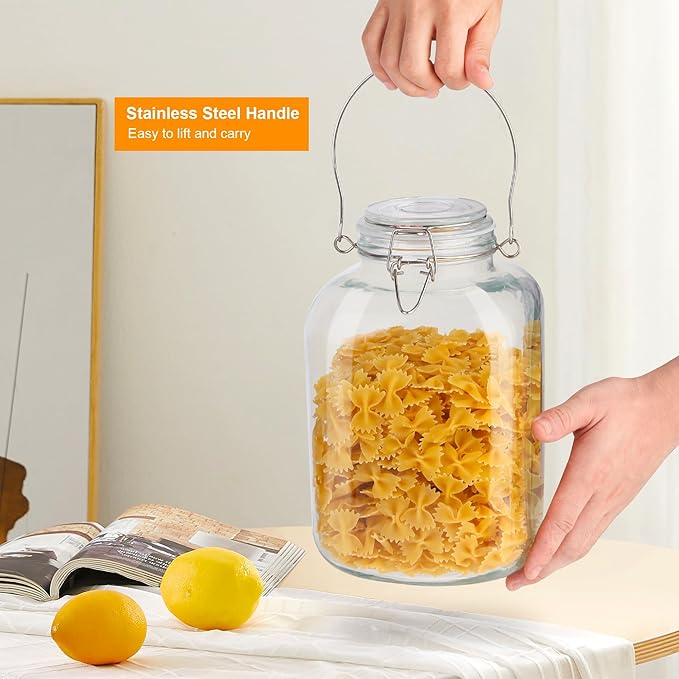 - [Sleek and Functional Design]Our large glass storage containers feature handles for convenient transportation and storage solutions.The handles make it easy to lift and carry the glass jars from one place to another, whether you're moving them around the kitchen or transporting them to a different location.Our storage jars are both durable and stylish. The sleek design adds a touch of elegance to your kitchen decor.