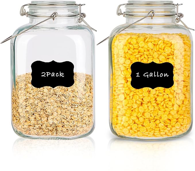 1 Gallon Glass Jar with Lid, 128oz Glass Jars with Airtight Lid Set of 2, Square Mason Jars, Large Storage Containers with Handle for Canning, Pasta, Flour, Sugar, Rice, Coffee Beans, Cereal