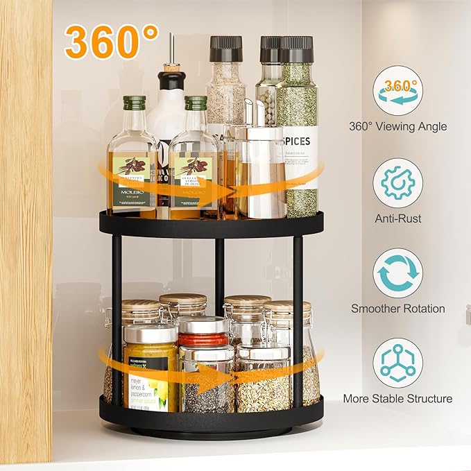 - 【360 Degree Rotating】360° Rotatable Design - This 2-tier lazy Susan makes it easy to access spices, canned goods, coffee, and more in your countertop, cabinet, or pantry. Simply rotate it to find the items you need quickly and effortlessly.