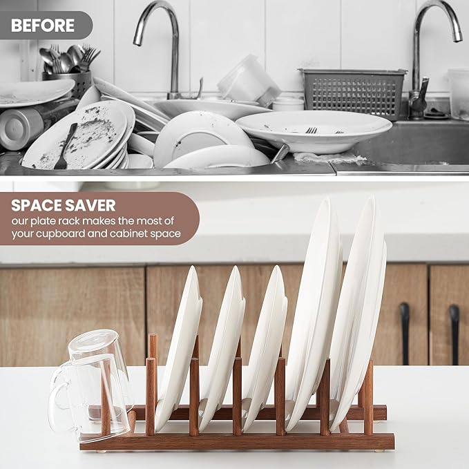 - Unparalleled Organization for Every Room: Our plate organizer goes beyond kitchen storage. It effortlessly accommodates plates, cups, pot lids, pans, cutting boards, and more, thanks to its adjustable design. You can even use it outside the kitchen as a bookshelf, laptop stand, puzzle storage, or tray holder. The bamboo plate organizer not only provides efficient storage but also adds a touch of simplistic beauty to your home decor. Enjoy a clutter-free in style.