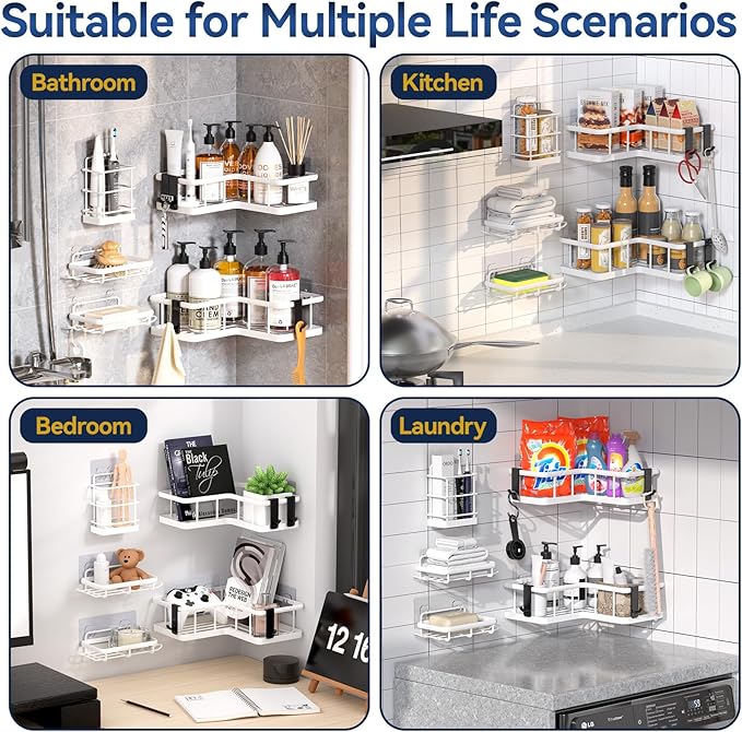 - NO TOOLS & EASY INSTALLATION:Install this rust-proof shower caddy corner in minutes: Clean surface → Apply industrial-grade adhesive → Hang & wait 24hrs. Contains 7 sets of adhesive stickers suitable for smooth tile/glass/marble (not suitable for textured walls)