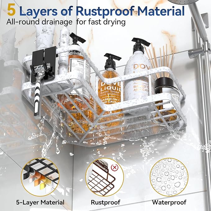- PREMIUM METAL MATERIAL: The shower caddy corner is made of high-quality stainless steel、waterproof and rust-proof and easy to clean. The hollow design does not accumulate water at the bottom, ensuring that the bathroom supplies are clean and dry