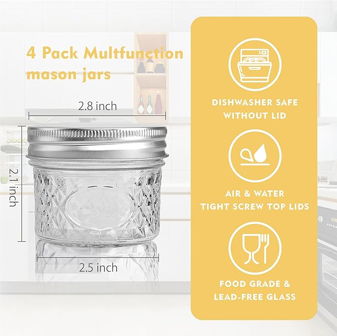 - MULTI-FUNCTIONAL JAR: The airtight mason salad jar 2.7inch wide mouth design, easy to store food and clean. can preserve various food such as jams, chutneys, flour, cereal, grain, sugar cube, spices, condiment, pepper, nuts, tea, coffee bean, biscuits, cookies, chocolates, crackers, snacks, pasta, rice, dried fruit, candy, cereal grain.