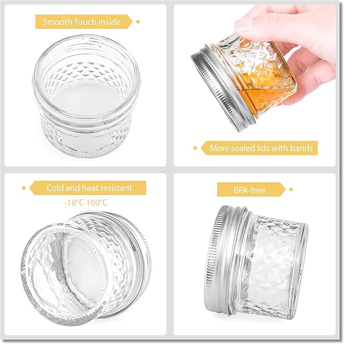 - THREADED SEALING LID: The overnight oats containers with metal cover, each lid has a built-in sealing ring, excellent sealing performance, which can keep food fresh and prevent spillage when carrying. 4-ounce vintage style jars can store liquid foods such as overnight cereal, salad, homemade juices, drinks, honey, pickles, wine, pickling fruits and veggies.