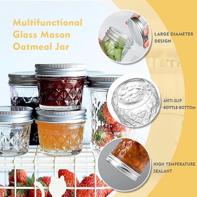 - SPACE SAVING: Glass overnight oatmeal jars can save your storage space by stacking them for use, and the decorative clear glass allows you to easily identify the food in the jar.Our glass jars with lids are not only suitable for kitchen use, but also great for office, travel, picnics, barbecues, parties.