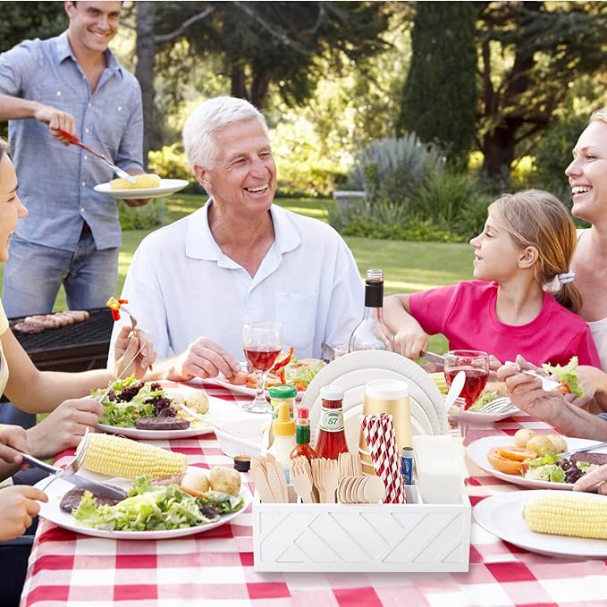 Utensil Holder for Party-Paper Plate Organizer for Countertop, Rustic Wood Silverware Caddy with 7 Compartments for Plate, Cup, Fork, Spoonpicnic Caddy for Plates and Utensils-White
