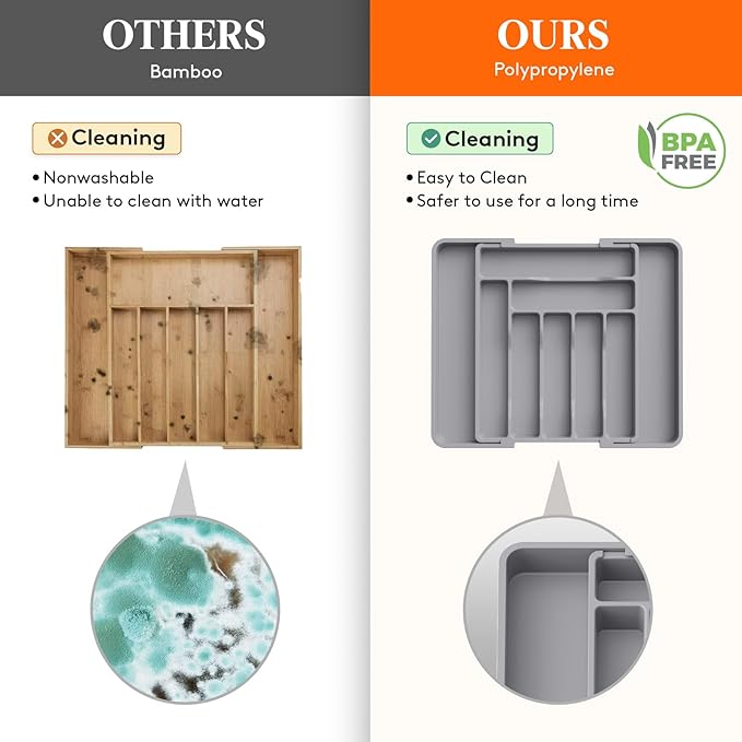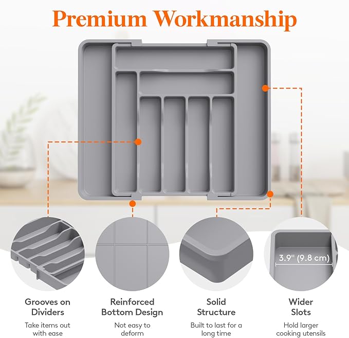 - Premium Construction: The utensil organizer for kitchen drawers is made of BPA-free PP material, ensuring its safety with all types of utensils, silverware and flatware. It has a solid bottom panel with sturdy dividers, keeping your silverware in place