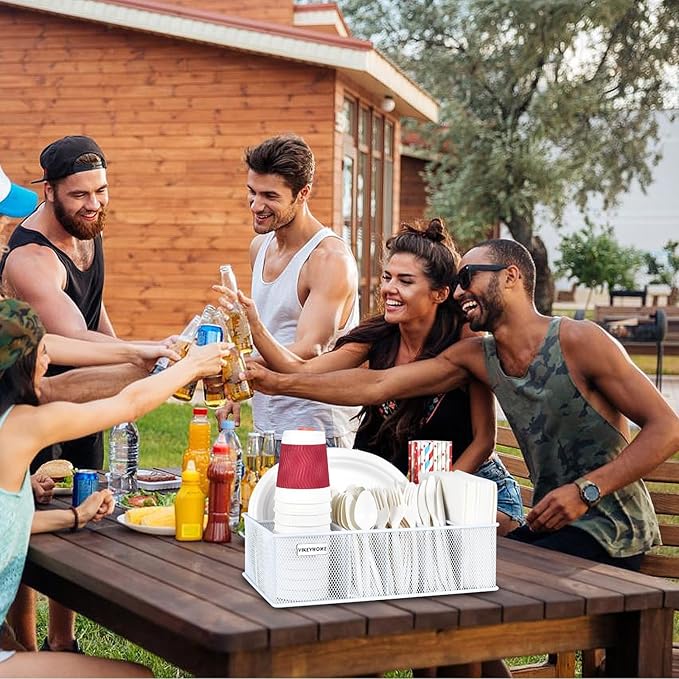 - 【Great for Camping and Picnic】 Ideal for camping and picnics, this caddy offers ample space for all your essentials. It enables you to effortlessly store paper plates, silverware, cups, and napkins, providing easy access to everything.