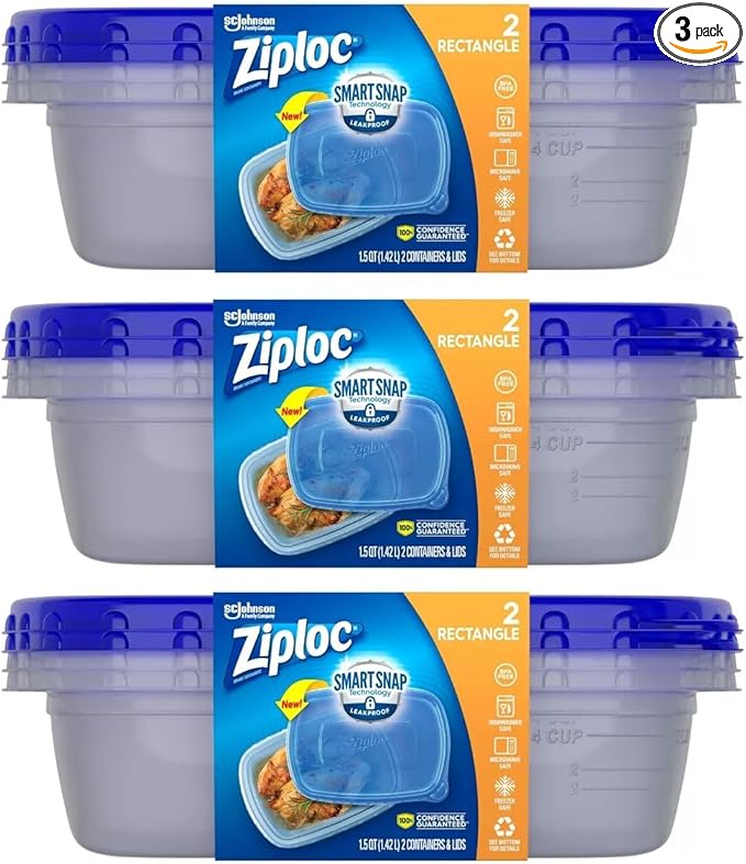 Ziploc Food Storage Meal Prep Containers with Smart Snap Technology, Rectangle, 1.5 QTS, 2 Count, Pack of 3, Clear