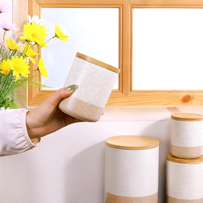- 【High-quality Material】-The canisters are made of high-quality terracotta, which is not easy to crack and mold and is more durable than plastic and glass. The lid is made of bamboo wood, with an environmentally friendly sealing rubber ring to improve the sealing. Effectively keep the items dry and fresh.